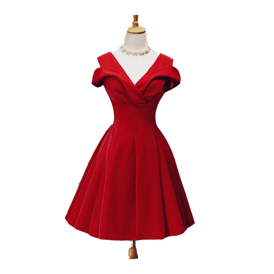 Rood Sexy V Hals A Lijn Jurk Korte Mouw Satin Prom Gown Voor
