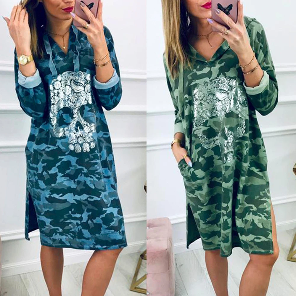 Camouflage Schedel Print Herfst Casual Hoodies Jurk Hooded Lange