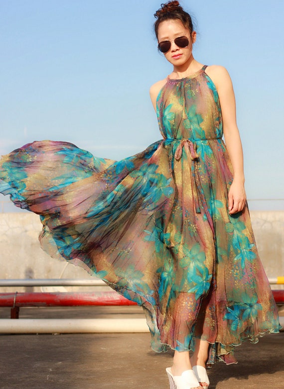 Peacock Blauwe Bruin Maxi Jurk Floral Chiffon Jurk Lange Etsy