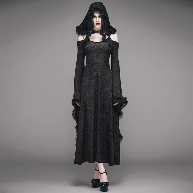 Eva Lady Gothic Dark Kant Hooded Jurk Steampunk Flare Mouwen Sexy