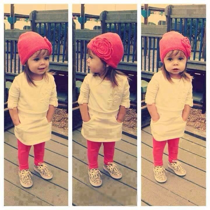 Cute Girls Outfits Ecru Jurk Roze Gebreide Muts Roze Legging