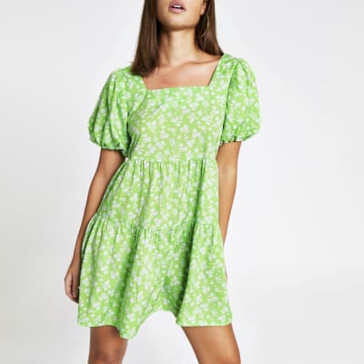 Groene Gesmokte Mini Jurk Met Bloemenprint En Korte Mouwen River