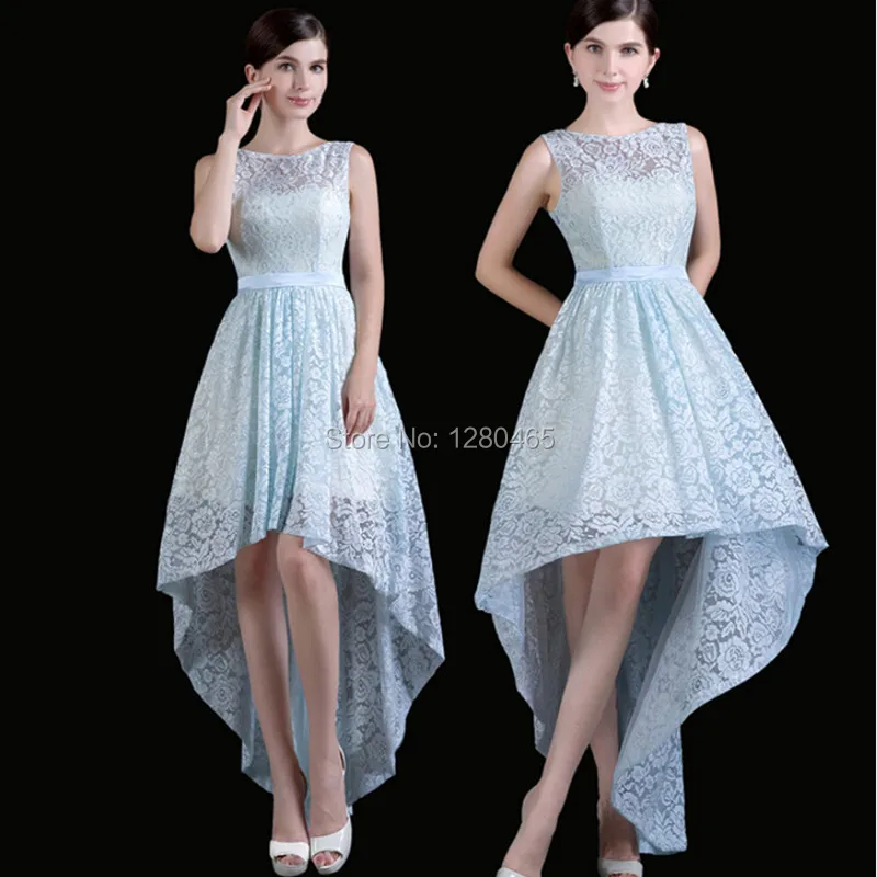 Licht Ijsblauw Korte Kant Bruidsmeisje Jurk Hi Lage Korte Voor