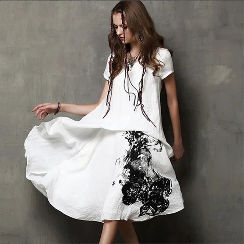 Vintage Kalligrafie Vrouwen Jurk 80 Katoen 20 Linnen Korte