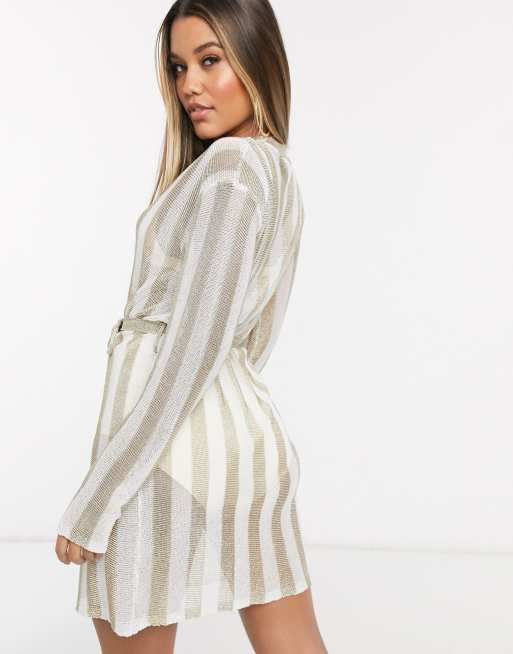 Lioness Gestreepte Mini Jurk Met Overslag Vooraan In Goudkleurig