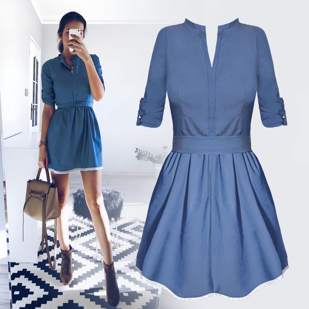 Lente Nieuwe Mode Sexy V Hals Effen Kleur Jurk Blauw Denim Sjerpen