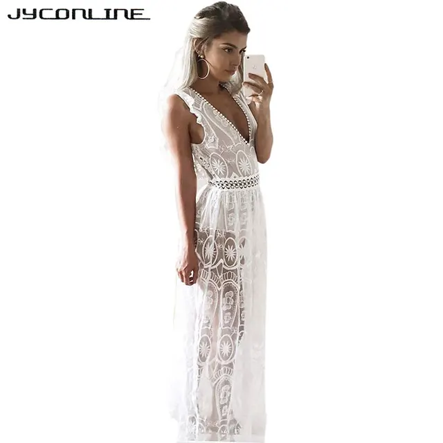 Jyconline White Hollow Out Sexy Lace Dress Women Summer Long Maxi