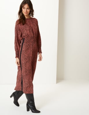 Getailleerde Midi Jurk Met Lange Mouwen En Dierenprint Jurken En