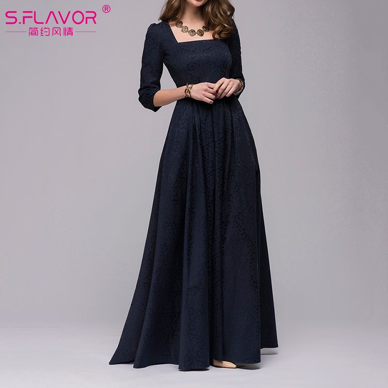 Vrouwen Vintage Vierkante Kraag Lange Jurk Nieuwe Elegante Effen