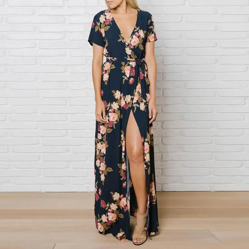 Bohemian Bloemenprint Bloem Lange Jurk Korte Mouw Enkellange Diepe