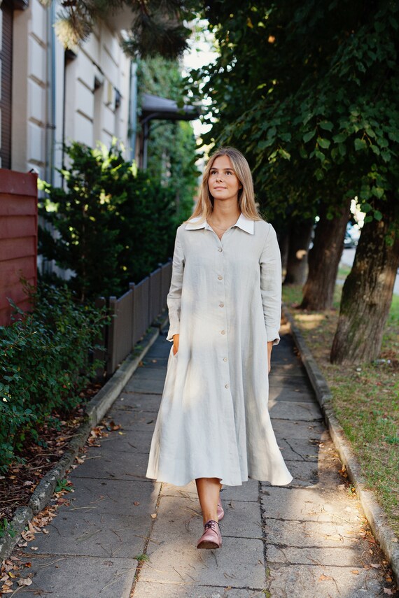 Licht Grijze Linnen Jurk Knop Ingedrukt Linnen Jas A Lijn Etsy