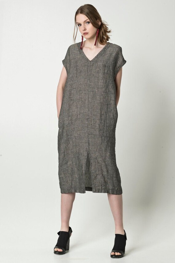 Boxy Linnen Jurk Met Zakken Korte Mouw Linnen Tuniek Jurk Midi Etsy