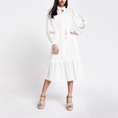 Cremekleurige Geborduurde Midi Jurk Met Lange Mouwen River Island