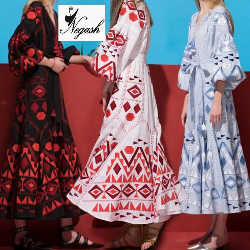 Katoen Linnen Maxi Jurk Geborduurde Bloemen Patroon Tassles