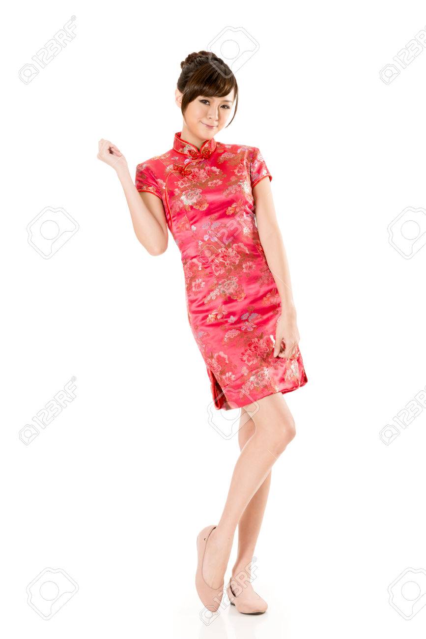 Lachende Chinese Vrouw Jurk Traditionele Cheongsam Op Nieuwjaar