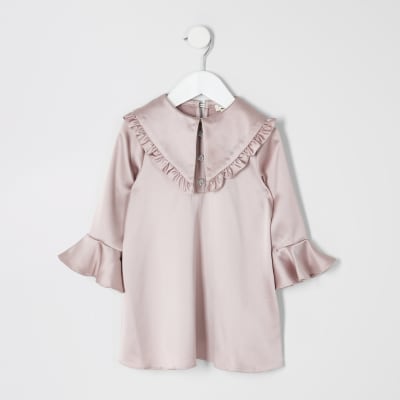 Mini Roze Satijnen Jurk Met Ruches Rond Kraag Voor Meisjes