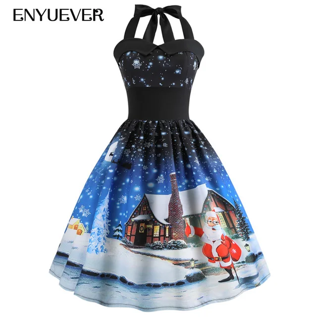 Enyuever Sukienka Vintage Christmas Dress Jurk Kerst Halter Snowfl