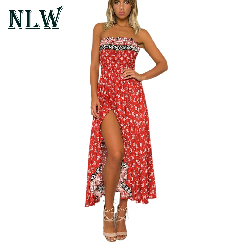 Nlw Off Shoulder Rode Boho Bloemenprint Strapless Jurk Vrouwen