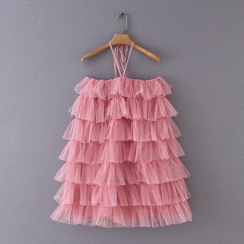 Vrouwen Zoete Ruches Netto Garen Halter Taart Jurk Vrouwelijke