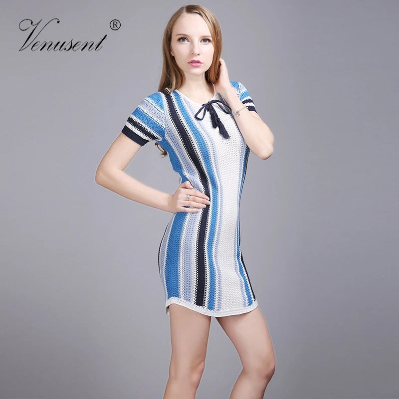 Witte Strepen Tussen Blauw Trui Jurk Korte Mouw Hol Truien